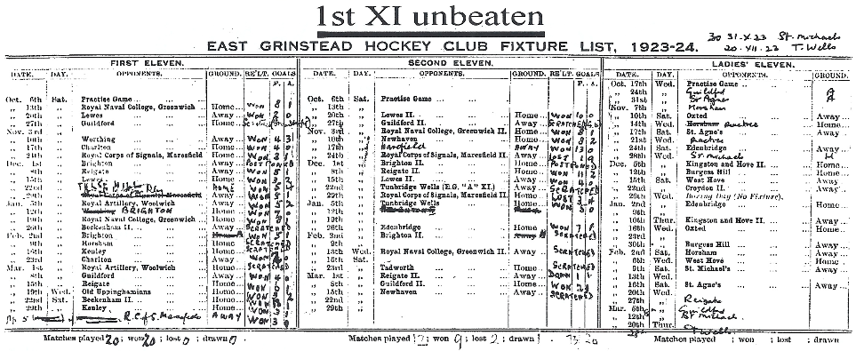 The grounds left much to be desired as the following match report, one o fthe earliest discovered, indicates quite clearly. Brighton v. East Grinstead - Played at Dormans Park, East Grinstead, on Saturday Dec. 7th Result: Brighton 2, East Grinstead 0. Owing to the length of the journey it was past 3 o'clock before the game started, but before five minutes play had taken place Brighton scored twice, P. Hill (2). After this the game could hardly be called hockey, the ground being quite unfit for the game, no further scoring took place and the game ended as above stated.